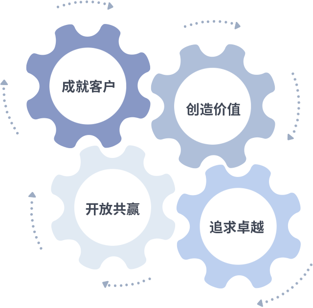成就客户是一切决策的出发点,,,创造价值是衡量所有工作的标准,,,追求卓越是我们做事做人的态度,,,开放共赢是我们的格局也是最终的结果。。价值观的齿轮环环相扣,,推动着组织里的每个人不断向前。。